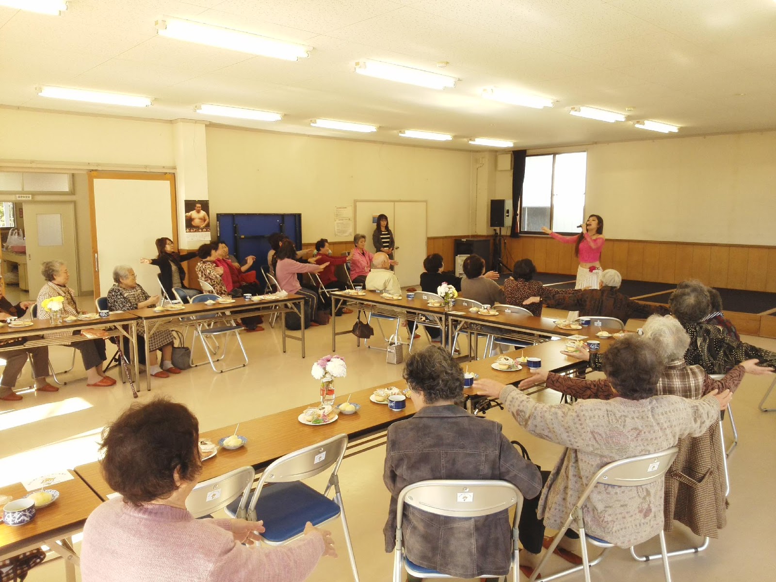 ベリーダンス教室といっても高齢者の方が多かったので、音楽に合わせて座ったままでもできるような簡単なダンス(体操)を行い、先生から「イメージしながら体を動かすこと」「体を動かす時に実際に声を出すこと」などをわかりやすく教えていただきました。