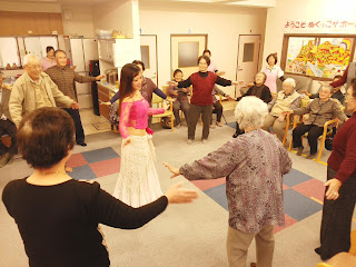 ベリーダンス教室といっても高齢者の方が多かったので、音楽に合わせて座ったままでもできるような簡単なダンス(体操)を行い、先生から「イメージしながら体を動かすこと」「体を動かす時に実際に声を出すこと」などをわかりやすく教えていただきました。