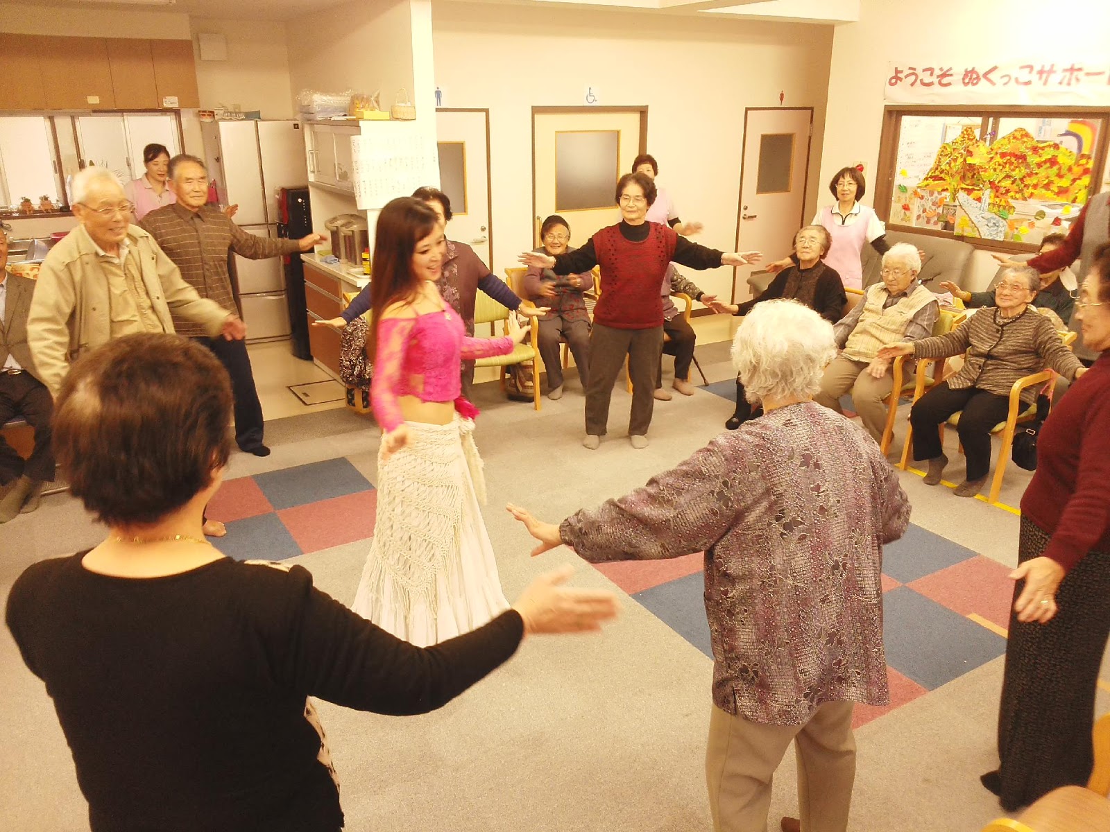 ベリーダンス教室といっても高齢者の方が多かったので、音楽に合わせて座ったままでもできるような簡単なダンス(体操)を行い、先生から「イメージしながら体を動かすこと」「体を動かす時に実際に声を出すこと」などをわかりやすく教えていただきました。